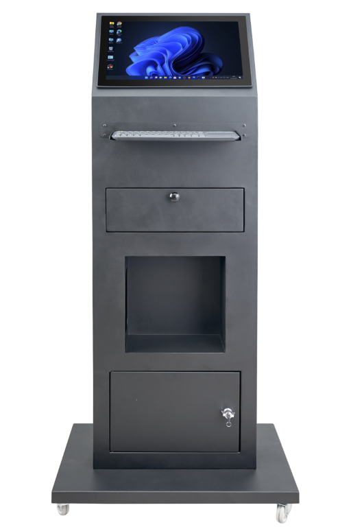 Quanmax Q-Serisi 18.5” Kiosk Panel PC Stand | Klavyeli, Tekerlekli, Yan Okuyuculu Çözüm
